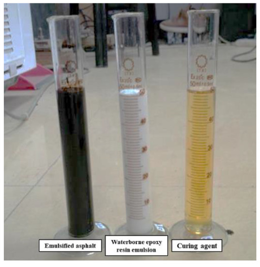 The epoxy-emulsified asphalt mainly comprised emulsified asphalt, waterborne epoxy resin emulsion, and curing agent (Figure 2). To improve the material shelf life, the aforementioned three components of the material were generally stored separately. Each component was mixed according to the formula at room temperature and stirred evenly with glass rod before use.