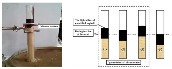 In the quantitative penetration test, the determination of the actual penetration depth of the emulsified asphalt was hindered by problems such as an uneven penetration interface and “gas resistance” phenomenon (Figure 3). For this reason, the permeability test method proposed by Song and Meng was modified and improved [37,38]. Figure 4 shows the improved penetration test device, which is suitable for measuring and comparing the permeability of different fog-sealing adhesive materials.