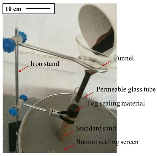 The test steps mainly included the following: (1) First, 6 g of liquid to be tested and 60 g of standard sand were prepared. (2) Then, 60 g of standard sand was rotated around the opening of the funnel to ensure uniform density of the standard sand in the glass tube. Then, the sand filling time was recorded. (3) A total of 6 g of the liquid to be tested was poured into the glass tube using a funnel. The time required for the liquid to drop on the standard sand surface was measured. Further, the time required for the liquid to permeate on the standard sand surface was measured, and the penetration of the liquid was observed. If the liquid did not continue to infiltrate within 1 min, this period was recorded as the penetration time T of the liquid to be measured in the standard sand. (4) After the penetration of the liquid to be tested was completed, the glass tube was lifted and the standard sand remaining on the screen was weighed. (5) The aforementioned steps were repeated for different liquids to be tested, and the sand filling time was consistent. (6) Based on Equations (1) and (2), the permeability velocity V of the liquid to be tested was calculated and its permeability was evaluated.