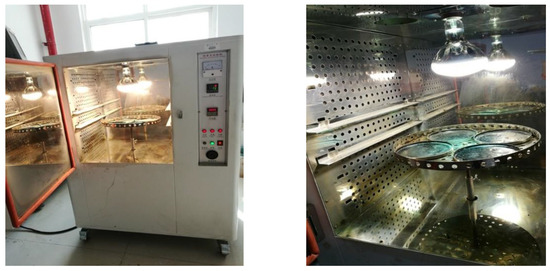 The antiyellowing aging box independently developed by Chang′an University was adopted as the test instrument (Figure 6). The test parameters (Chang′an University, Xi’an, China) were as follows: irradiation intensity 250 W/m2, aging temperature 60 °C, irradiation height 30 cm from the aging specimen, and aging time 48 h.