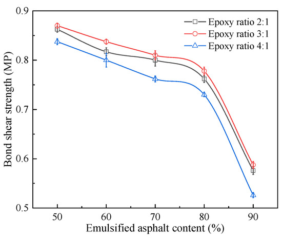 When the emulsified asphalt content is greater than 80%, the bond shear strength of epoxy-emulsified asphalt decreases rapidly. In other words, when the emulsified asphalt content is increased by 10%, the bond shear strength of specimens decreases by approximately 25%. This may be because, when the amount of emulsified asphalt is small, no effective oil film thickness is formed between layers, and the bond shear strength increases with the increase of the amount of emulsified asphalt. When the amount of emulsified asphalt begins to exceed a certain amount, the excess emulsified asphalt will form a sliding surface between layers, which will reduce the bond shear strength. When emulsified asphalt exceeds the optimal amount, a weak sliding surface is formed between layers, and the bond shear strength will decrease rapidly, which is consistent with the performance in this paper when the emulsified asphalt amount is >80% [40]. Therefore, the emulsified asphalt content should ideally not exceed 80%.