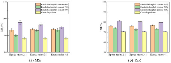 Figure 10 shows that the MS0 and TSR values obtained for the fog-sealing adhesive specimens with different component contents are improved compared with the control specimens. When the emulsified asphalt content is 80%, the degree of improvement is high. The residual stabilities of A80(E2), A80(E3), and A80(E4) are 97.7%, 96.4%, and 95.0%, respectively, while the freeze–thaw splitting strength ratios are 81.3%, 80.5%, and 79.6%, respectively. Compared with the control specimens, the MS0 values are increased by 10.6%, 9.2%, and 7.6%, and the TSR values are increased by 15.3%, 14.2%, and 12.9% in the case of A80(E2), A80(E3), and A80(E4), respectively. This result may be attributed to the gradual increase in the free asphalt in the mixture with increasing emulsified asphalt contents, filled parts of the original void surfaces, reduced numbers of voids in the mixture, and improved permeability and bonding properties of the mixture to a certain extent [41].