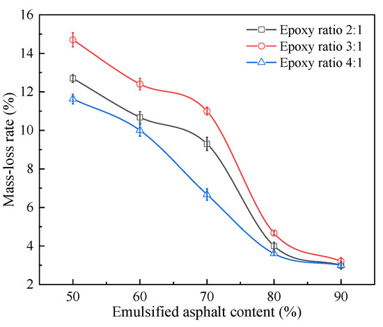 Based on Figure 10, the mass-loss rate of epoxy-emulsified asphalt is as follows: epoxy ratios 3:1 > 2:1 > 4:1. When the emulsified asphalt content is increased, the mass-loss rate of epoxy-emulsified asphalt after photothermal aging gradually decreases. When the emulsified asphalt content is ≥ 80%, the mass-loss rate starts stabilizing, and no significant difference is observed in the mass-loss rate of epoxy-emulsified asphalt under the three epoxy ratios. In other words, the curing agent content has a slight effect on the mass-loss rate of epoxy-emulsified asphalt after photothermal aging. Therefore, the emulsified asphalt content should ideally not be <80%.