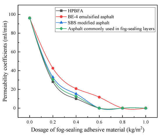 Table 6 shows that the penetration velocity of HPBFA is 1.29 cm/min, which is 0.54, 8.06, and 3.69 times higher than those of BE-4-emulsified asphalt, SBS-modified emulsified asphalt, and the asphalt commonly used in fog-sealing layers, respectively. The results show that the permeability of HPBFA is slightly lower than that of BE-4-emulsified asphalt but still exhibits obvious advantages.