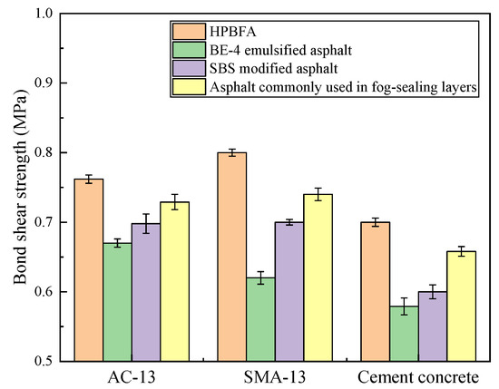 For three common pavement structures, namely, AC-13, SMA-13, and cement concrete, the test results of the bonding shear strength of HPBFA-cured specimens are shown in Figure 12. There were six parallel samples in a group, and the results were representative values according to the Grubbs method.