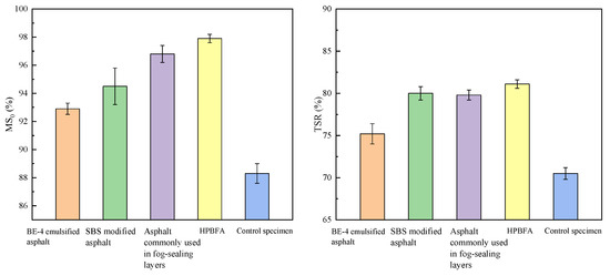 Figure 13 shows that the MS0 and TSR values of the HPBFA specimens are improved compared with the control specimens. The MS0 values of the BE-4-emulsified asphalt, SBS-modified emulsified asphalt, the asphalt commonly used in fog-sealing layers, and HPBFA specimens increase by 5.1%, 7.0%, 9.6%, and 10.6%, respectively, while the TSR values increase by 6.8%, 13.6%, 13.6%, and 15.3%, respectively. These results indicate that HPBFA exhibits better permeability and cohesion and can better penetrate the pavement voids and bind loose aggregates.