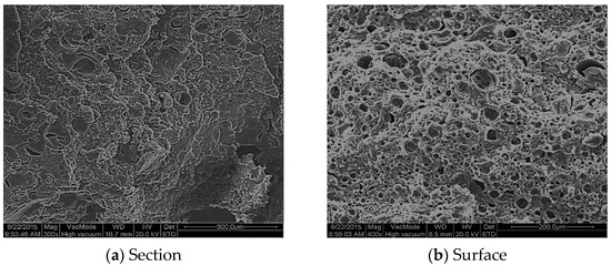 The HPBFA-cured specimens were prepared, and the fracture surface and surface were etched with petroleum ether and sprayed with gold, respectively. A Quanta200 environmental scanning electron microscope (FEI Company, Eindhoven, Netherlands) was used to observe the section and surface appearance structure of the specimen (Figure 14).