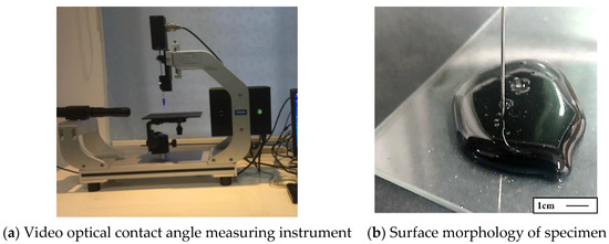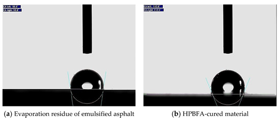 An OCA-20 video optical contact angle measuring instrument (DATAPHYSICS, Filderstadt, Germany) was used to measure the contact angle between the evaporation residue of emulsified asphalt and HPBFA-cured material and compare the sealing hydrophobicity (Figure 15). Figure 16 presents the test results.