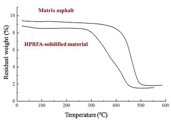 A Pyris-I TGA instrument (PERKINELMER, Waltham, MA, USA) was used to conduct the thermal stability analysis of the HPBFA-cured material and matrix asphalt specimen, and the curve is shown in Figure 16. The flow rate of the nitrogen atmosphere was set to 50 thermogravimetric (TG) analysis mL/min, and the heating rate was set to 5 °C/min.