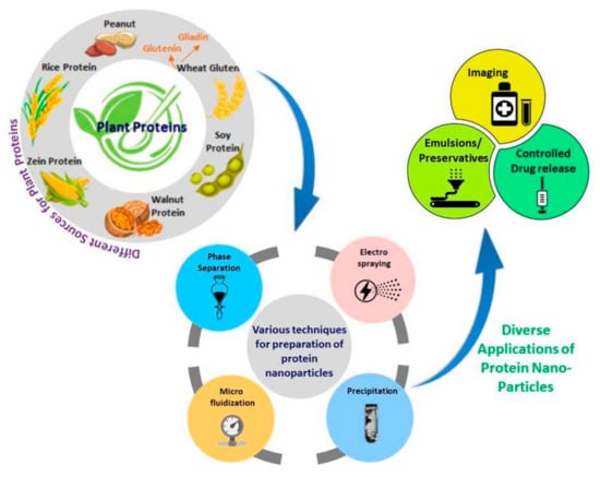 Compared to carbohydrates or metals, protein-based nanoparticles have been considered ideal for medical, food, cosmetic, and other applications. Proteins offer the possibility for surface modifications and the attachment of drugs and other biomolecules through covalent, ionic, hydrogen bonding and other associations. Both animal- and plant-based proteins have been extensively studied and made into nanoparticles using different techniques [7,8]. Zein from corn, gliadin and glutenin from wheat gluten, and soy proteins are some of the common plant proteins used for developing nanoparticles. Proteins in lesser-known legumes such as peanuts and chickpeas, and proteins in plant extracts are also considered as sources for nanoparticles. Similarly, animal-based proteins such as collagen, albumin and keratin from feathers and wool have been studied for developing nanoparticles. Fibroin and sericin in silk are also found to provide nanoparticles with excellent biocompatibility, stability, and properties required for medical applications. A few proteins such as zein have inherent fluorescence, which is useful for imaging and detection purposes. Compared to animal proteins, plant proteins do not cause immunogenicity and are hence preferable for developing nanomaterials [9,10]. An overview of the major plant proteins used for developing nanoparticles, the common methods of preparation, and their applications are given in Figure 1.