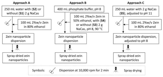 Three different approaches used to prepare zein nanoparticles through spray drying. Reprinted with permission from ref. [15]. Copyright 2014 Elsevier.