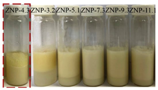 In a relatively simple process, it was reported that adjusting the pH of a zein solution could change the surface properties and help to obtain nanoparticles with a lower size and higher stability. In this study, zein was dissolved in 80% ethanol and the pH was adjusted from 3.2 to 11.1 and incubated for 24 h. The treated zein was later dialyzed and the solution obtained was used to prepare the nanoparticles by co-precipitation in distilled water. The shape, size and properties of the nanoparticles changed substantially depending on the pH. For example, particle size, polydispersity index (PDI), and zeta potential were 58.5 nm, 0.142 and −45 mV at pH 11.1, compared to 430 nm, 0.427 and 27.6 mV at pH 3.2, respectively. Although treating the nanoparticles under alkaline conditions caused increased deamidation, no significant change in molecular weight was observed at the pHs studied. Pickering emulsions, which are difficult to maintain, showed considerable stability even after 28 days, after the addition of alkaline zein nanoparticles (Figure 3) [16]. Combining zein nanoparticles and cinnamon essential oil was also able to stabilize Pickering emulsions, and, further, to replace butter in pound cakes and prevent fungal growth [17]. It was suggested that the aldehyde groups of cinnamaldehyde could react with amino groups in zein and enhance the visco-elastic properties. A combination of 20 g zein nanoparticle solution, 15 g oil and 5 g cinnamon essential oil could replace 20% of butter, improve shelf life, and also lower calorie intake without affecting the color or texture of pound cakes.