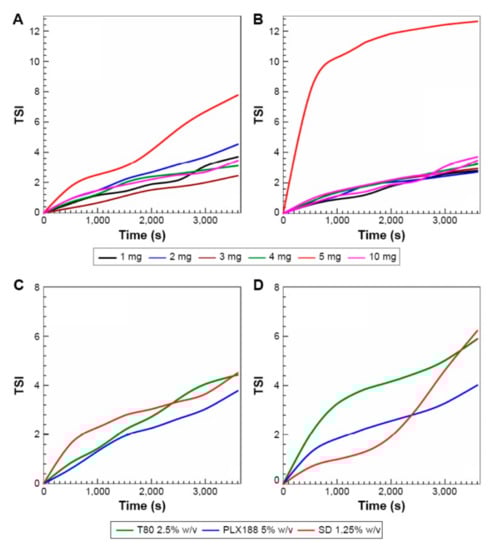 Effect of varying zein concentrations (A,B) and surfactants (C,D) on the formation conditions and Turbiscan Stability Index of zein nanoparticles. T 80 is Tween 80, PLX is Poloxamer 188, and SD is sodium deoxycholate monohydrate. Reprinted with permission from ref. [55]. Copyright 2018 Dove Press.