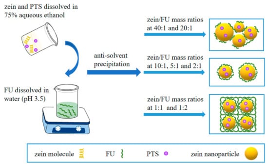 Schematic representation of the preparation of and possible interactions between zein, fucoidan (FU) and pterostilbene (PTS). Reprinted with permission from ref. [64]. Copyright 2020 Elsevier.