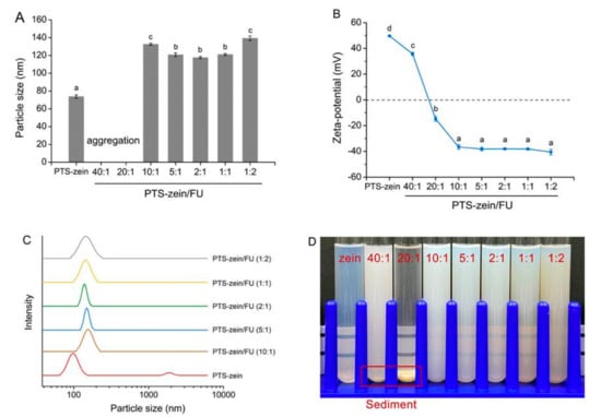 Properties of the composite zein-Fu nanoparticles with and without pterostilbene (PTS). Changes in the nanoparticle size (A), zeta potential (B), size variation with and without PTS (C), and the appearance of the nanoparticles (D). Reprinted with permission from ref. [64]. Copyright 2020 Elsevier.