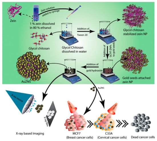 Zein is reported to have inherent fluorescent properties, which are desirable for imaging applications. Furthermore, additional fluorescence can be imparted by adding dyes and quantum dots. In one such attempt, zein nanoparticles were prepared through the liquid-liquid dispersion technique, followed by freeze-drying. Quantum dots were also prepared using zinc acetate and manganese sulfate, which were added into the zein solution. Later, 5-fluororocil, an anticancer drug, was conjugated onto the fluorescent nanoparticles, which showed an absorbance between 220 and 350 nm. The diameter of pure nanoparticles was between 600 and 700 nm, which increased to between 800 and 900 nm after being loaded with the drugs. The quantum dots were 5 nm in diameter and could be easily loaded onto the zein nanoparticles. The drugs loaded onto the nanoparticles had an encapsulation efficiency of 60% and a sustained release (70%) was possible in about 8 h. Zein- and quantum dot-containing particles had high cell viability for MCF7 breast cancer cells and L929 cells, but drug-loaded nanoparticles showed considerable cytotoxicity for both the cell lines [69]. Further, the internalized nanoparticles retained and emitted the fluorescence at detectable levels (Figure 8), and are hence considered suitable for imaging purposes. Zein-glycol chitosan complex nanoparticles (nanoshells) were developed using the anti-solvent precipitation method. These nanocomplexes were conjugated with folic acid or attached with gold seeds to make them suitable for imaging and for enhanced targeted delivery for treating cancer [70]. A schematic of the process used for preparing these nanoparticles is shown in Figure 9. The nanocomplexes were biocompatible and non-toxic even at considerably high dosages, responded to photothermal therapy, and acted as contrast agents for radiography. The uses of image-based diagnostics are expected to increase substantially. Most imaging techniques use metallic particles or synthetic dyes to visualize the target. Protein nanoparticles, specifically those having inherent fluorescent activity, could be safe, biodegradable and ideal for imaging applications.