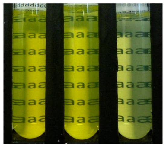 Curcumin-loaded zein-pectin core-shell nanoparticles were able to redisperse in water without any aggregation at three different concentrations of 8.8% (left), 4.25% (middle), and 0.84% (right). Reprinted with permission from ref. [76]. Copyright 2015 Elsevier.