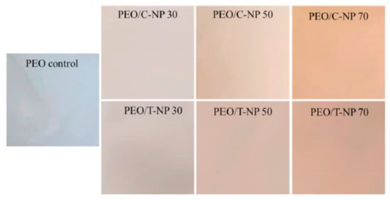 Changes in the appearance and transmittance of polyethylene oxide (PEO) films containing different levels of curcumin-loaded zein nanoparticles. Reprinted with permission from ref. [81]. Copyright 2020 Elsevier 3.