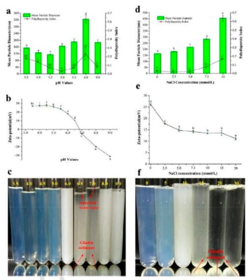 Changes in the size and zeta potential properties of gliadin nanoparticles with different pH (a,b) and NaCl concentrations (d,e). Visual images of the gliadin nanoparticles at different pHs (c) and NaCl concentrations (f). Reprinted with permission from ref. [90]. Copyright 2018 Taylor and Francis.