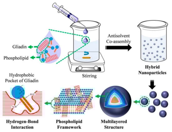 Unique hybrid gliadin phospholipid nanoparticles were developed with a gliadin-rich core and a phospholipid rich shell using the coassembly and antisolvent coprecipitation approach [91] (Figure 14). Different mass ratios of the proteins and phospholipids were used, and the changes in physical properties were investigated. The particle size increased from 78 to 145 nm when the mass ratio between the gliadin and phospholipids increased from 7:3 to 3:7. Similarly, the zeta potential and PDI were 30.2 and 0.34 for pure gliadin, respectively, but ranged between 16.9 and 23.9 and 0.18 and 0.26 for the hybrid nanoparticles, respectively. The particle size or zeta potential did not show any appreciable change when the nanoparticles were stored for 90 min at pH 4 or 5, even after boiling, or when the salt concentrations varied between 0 and 300 mmol/L. Further, the foamability and foam stability of the hybrid nanoparticles was considerably higher compared to unmodified gliadin nanoparticles, suggesting their suitability for use as emulsifiers and foaming agents [91].
