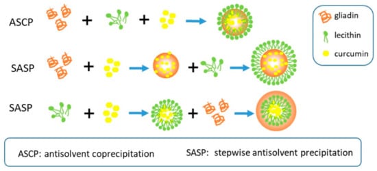 Since gliadin is soluble in aqueous ethanol, the most common and convenient approach for preparing nanoparticles is through the anti-solvent coprecipitation (ASCP) process. In a modified process, stepwise antisolvent precipitation (SASP) (Figure 15) of gliadin nanoparticles with lecithin was used to encapsulate and deliver curcumin. The blending sequence influenced the size of the nanoparticles, with the gliadin-lecithin-curcumin nanoparticles having a considerably larger diameter of 264 nm compared to 92 nm for pure gliadin. Curcumin was able to have hydrogen bonding, and electrostatic interactions with gliadin led to reduced hydrophilicity. An encapsulation efficiency of 91% and a loading capacity of 6% was achieved. The nanoparticles were able to protect curcumin against UV irradiation and thermal treatment, and also preserved curcumin’s antioxidant capacity to a higher extent than the conventional ASCP process [92].