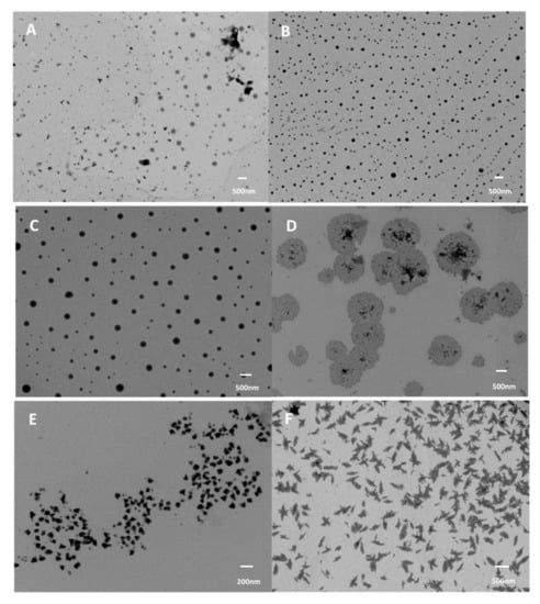 A liquid-liquid dispersion process was proposed to obtain zein nanoparticles for a food grade nanoscale delivery system [18]. In this approach, zein was dissolved in 55–90% aqueous ethanol and the solution was then sheared in deionized water using a homogenizer operating at speeds between 5000 and 15,000 rpm. The size and shape of the nanoparticles varied considerably depending on the shearing speed (Figure 4). The mean diameter of the nanoparticles generally decreased from about 400 to 180 nm as the shear rate increased from 1000 to 3000. The addition of 1% zein nanoparticles into carboxymethyl cellulose substantially modified the viscosity and made them suitable for food applications [18]. A liquid-liquid dispersion and anti-solvent precipitation system was found suitable to combine phytotherapy and nanotechnology to treat fish pathogens [19]. Phytochemicals such as eugenol, garlic essential oil, and a combination of the two were encapsulated in zein nanoparticles having an average diameter of 150 nm, a zeta potential of 30 mV and a PDI of 0.2. An encapsulation efficiency of up to 90% was possible, and the compounds did not show any decrease in activity even after 90 days. The encapsulated nanoparticles displayed antibacterial activity against pathogenic bacteria such as Aeromonas hydrophila, Edwardsiella tarda and Steptococcus iniae, suggesting their suitability in treating fish diseases [19].