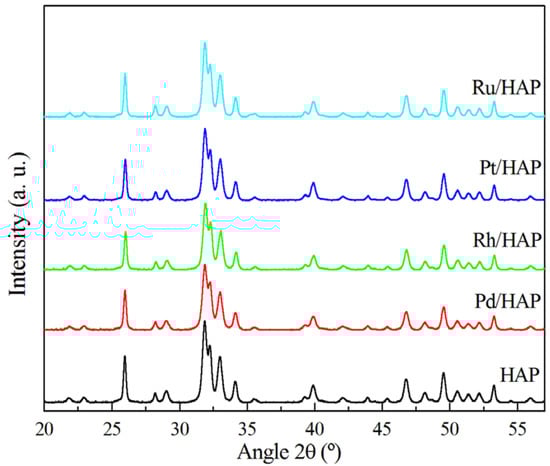 The XRD pattern of the HAP bare support (Figure 1) shows that the positions of all diffraction peaks are identical to those expected for the hydroxyapatite structure (JCPDS 01-082-2956), which crystallizes in an hexagonal system and belongs to the P63/m space group. The addition of noble metals (Pd, Rh, Pt, and Ru) to the HAP and the successive thermal treatment at 500 °C does not significantly affect the structure of the support and its lattice parameters (Supplementary Materials Table S1). Moreover, no additional diffraction peaks due to the deposited metals are observed, which can be explained by their small amounts (0.5 wt.%) and/or their high dispersion.