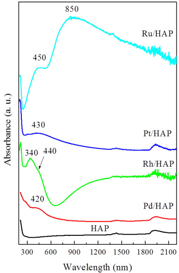 The optical properties of the supported metallic species were investigated using UV-Vis-NIR spectroscopy. Figure 2 shows the corresponding absorption spectra. The spectrum of the HAP support exhibits a strong UV absorption peaked at 200 nm and a shoulder near 280 nm, assigned to O2− → Ca2+ charge transfers. Irrespective of the nature of the added metal phase, these UV bands appear to intensify markedly, thereby indicating the contribution of O2− → Mx+ charge transfers. Moreover, new bands appear in the visible domain due to the d-d transitions of the cationic forms of the impregnated metals. Hence, the Pd/HAP sample exhibits a band centered at 420 nm, assigned to d-d (ν1 + ν2) transitions of Pd2+ ions in a tetrahedral coordination [1,7]. The spectrum of the Rh/HAP sample contains a strong absorption peaked at 340 nm accompanied by a shoulder near 440 nm. According to our previous study, the observed shape and positions indicate the main occurrence of Rh2O3 species [18]. The spectrum of the Pt/HAP sample is characterized by the presence of a much less intense visible band located at 430 nm, thus suggesting a deposition of relatively smaller amounts of the Pt cationic species. The position of this feature is very close to that observed on the spectrum of a PtO2 phase, as reported by Lietz et al. [25]. The deposition of Ru on the HAP support induces the occurrence of a broad absorption band extended from the visible to the NIR region and peaked at 850 nm. Xiao et al. [26] observed a similar feature, which was assigned to hydrous RuO2 nanoparticles (RuO2·xH2O).