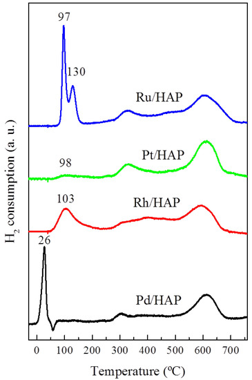The reducibility of the prepared catalysts was investigated by H2-TPR. The corresponding profiles and their quantification data are included in Figure 3 and Table 1, respectively. The Pd/HAP catalyst exhibits a typical diagram of the reduction of supported PdO species [7]. The first uptake, which peaked at 26 °C, is ascribed to the PdO phase whereas the second, located at 58 °C (negative peak), is due to the decomposition of palladium hydride (Pd-H). The profile of the Rh/HAP catalyst presents a broad reduction peak centered at 103 °C. This position is comparable to that found in a previous study on Rh/Al2O3 and Rh/CeO2 systems [27]. In good agreement with the UV-Vis-NIR data, the amounts of consumed H2 suggest that the oxidized Rh species is mainly composed of the Rh2O3 phase (Table 1). The H2-TPR profile of the Pt/HAP catalyst is characterized by the presence of a much less intense reduction peak located at 98 °C. Moreover, the estimated H2/Pt molar ratio does not exceed 0.4 (Table 1). This result could be explained by the presence of additional species, probably exhibiting a strong interaction with the support that require a high reduction temperature [22]. Instead, according to the UV-Vis-NIR data, these results indicate the deposition of relatively small amounts of oxidized Pt species. The H2-TPR profile for the Ru/HAP sample displays two reduction peaks located at 97 and 130 °C. These features could be assigned to the reduction of two distinct ruthenium oxide species. Generally, the low temperature peak is attributed to RuO2 phase, whereas the peak at relatively higher temperatures can be associated with Ru species exhibiting a stronger interaction with the support [28]. The quantification of H2 consumption reveals that the calculated H2/Ru molar ratio is close to that corresponding to a stoichiometric RuO2 phase (Table 1). It is worth noting that the reduction temperatures of the Ru species found on our Ru/HAP sample are significantly lower than those observed on other catalyst supports [28,29]. Lanza et al. [29] attributed this effect to the occurrence of easily reducible species (RuO2-y(OH)y), resulting from the interaction of the RuO2 species with surface hydroxyl groups.