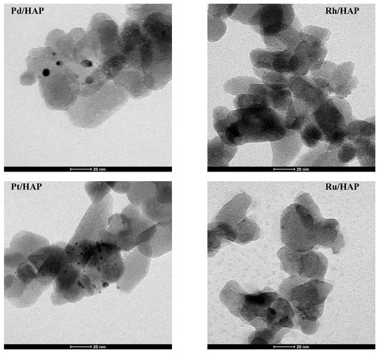 The N2 adsorption/desorption isotherms corresponding to the bare support and the four noble metal-modified samples, respectively, are presented in Supplementary Materials Figure S1. All samples exhibit similar shapes of both the isotherms and hysteresis loops. The adsorption branches are analogous to those of type II whereas the desorption isotherms present a hysteresis loop of H3, typically found over aggregates presenting slit-shaped pores. Data from Table 1 reveal that the modification of the HAP support with the noble metals does not provoke significant changes in its textural properties. The measured specific surface areas were found to range between 48 and 53 m2 g−1 (55 m2 g−1 for the bare support).