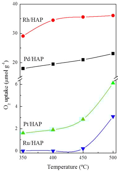 The results corresponding to the OSC experiments, in the temperature range between 350 and 500 °C, are displayed in Figure 5. These studies provide valuable information about the ability of the reduced catalysts to be re-oxidized. It should be noted that the samples were pretreated under a reducing atmosphere (5% H2/Ar) at 500 °C for 1 h. As expected, over all analyzed samples the OSC activity increases with the temperature. Moreover, a comparison of the OSC values for the different catalysts reveals that they follow this general trend: Rh/HAP > Pd/HAP > Pt/HAP > Ru/HAP. Interestingly, at 500 °C, the oxygen uptakes measured on the Pd and Rh catalysts (23.1 and 36.1 μmolO2 g−1, respectively) are very similar to the theoretical values required for the formation of stoichiometric PdO and Rh2O3 phases, respectively. However, regardless of the analysis temperature, the Pt and Ru catalysts show very low OSC. Despite increasing the temperature to 500 °C, the amounts of stored oxygen do not exceed 6.1 and 3.1 μmolO2 g−1, respectively, thereby suggesting that their complete oxidation is a very slow process which probably requires higher temperatures. Instead, this low OSC activity can be related to the oxygen storage sites located at the near surface only.