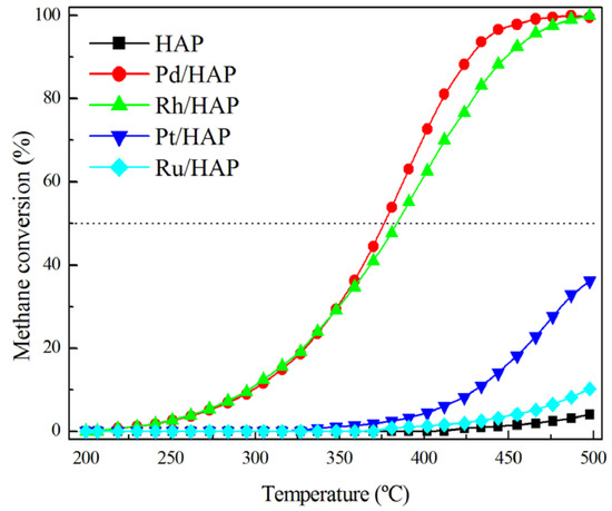 Figure 6 displays the light-off curves of the prepared catalysts in the methane oxidation reaction. Note that carbon dioxide was the main carbonaceous product detected and only negligible amounts of carbon monoxide could be observed. As expected, the HAP bare support shows a low activity, which does not reach 4% at 500 °C. Over the Pd/HAP and Rh/HAP samples, methane conversion starts at 225 °C and increases slowly with the temperature to reach 30% at 350 °C. At higher temperatures, the Pd/HAP catalyst becomes more efficient than the Rh/HAP sample. Nevertheless, over the latter the total oxidation of methane can be reached when raising the reaction temperature to 500 °C. However, the Pt/HAP and Ru/HAP samples exhibit a poorer performance, because methane oxidation is only visible above 350 °C and the conversion levels at 500 °C do not exceed 35% and 15%, respectively. Thus, the catalyst efficiency follows this general trend: Pd/HAP > Rh/HAP > Pt/HAP > Ru/HAP. This is in good agreement with the literature data, in which palladium catalysts are generally regarded as the most promising candidates for complete methane oxidation [30,31,32,33]. For instance, a similar trend was reported by Oh et al. [30] in their study on the activity of γ-Al2O3-supported catalysts under both oxidizing and reducing conditions (Pd > Rh > Pt). On the other hand, when subjected to a second light-off experiment, the Pd/HAP and Rh/HAP catalysts show a moderate deactivation process (Figure S2). Thereafter, they maintain a stable performance.