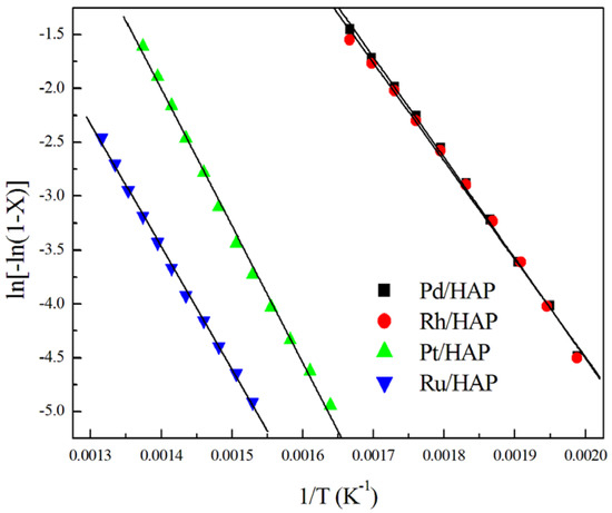 The apparent activation energy (Ea) values were estimated assuming a first order reaction. Thus, a linear correlation can be observed between ln[-ln(1-XCH4)] and 1/T (Figure 7). As expected, the most active catalysts (Pd/HAP and Rh/HAP) show the lowest Ea values (76–77 kJ mol−1) compared with those estimated over Pt/HAP and Ru/HAP catalysts (105 and 95 kJ mol−1, respectively) (Table 2). Note that our estimated values are comparable to those reported over noble metals supported on different materials [31,32,33,34,35].