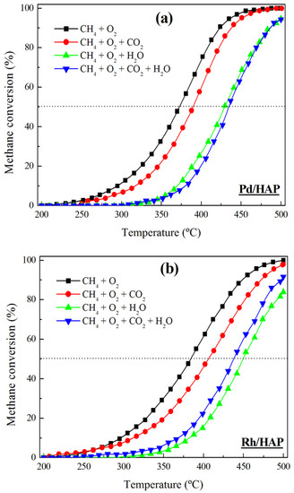 Given the promising performance of the Pd/HAP and Rh/HAP samples, additional experiments were carried out to study the effect of the addition of H2O and CO2 on their catalytic efficiency (Figure 8). Irrespective of the reaction mixture composition (CH4/O2, CH4/O2/CO2, CH4/O2/H2O, and CH4/O2/CO2/H2O), the Pd/HAP sample exhibits a higher activity than the Rh/HAP catalyst. The addition of CO2 causes a negative effect on the behavior of the two catalysts, which can be associated with the accumulation of carbonates on the catalyst surface [36]. However, the deactivation process is found to be more profound with the addition of water. At 400 °C, feeding water provokes a significant drop in the conversion over the Pd/HAP sample (from 75% to 25%). Similarly, over the Rh/HAP catalyst the conversion decreases from 63% to 15%. According to previous studies, the presence of water causes a severe hydroxylation of the surface’s active sites, which inhibits the re-oxidation of the noble metal catalysts [37,38,39,40,41,42]. For instance, the deactivation of Pd by water was described as a reversible process involving the formation of the inactive Pd(OH)2 phase (PdO + H2O ↔ Pd(OH)2) [37,38,39,41]. Interestingly, the extent of deactivation by water appears to be much lower at higher temperatures. For instance, at 500 °C, a slight decrease in the Pd/HAP activity can be observed, from 100% to 95%. In the case of the Rh/HAP catalyst, the effect of water is somewhat more appreciable because the conversion levels decrease from 100% to 84% at 500 °C. A simultaneous feeding of water and CO2 influences the performance of the two catalysts via different pathways. Over the Pd/HAP sample, the conversion values are slightly lower than those observed when adding water alone. By contrast, in the presence of water and CO2 the activity of the Rh/HAP sample is higher than that observed when adding water alone. It should be highlighted that in all cases the extent of the inhibiting effect of water and CO2 is significantly lower when working at high temperatures (>475 °C). Florén et al. [36] reported a similar effect in their study on the activity of a Pd/Al2O3 catalyst in a methane oxidation reaction. They associated this behavior, observed at high temperatures, with the low coverage of bicarbonates and adsorbed water, which hinder the dissociative adsorption of methane on the Pd-O site pair.