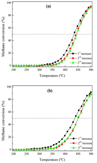 Activity of (a) Pd/HAP and (b) Rh/HAP catalysts submitted to three cycles of a realistic methane oxidation mixture: 1% CH4, 20% O2, 10% H2O, and 10% CO2.