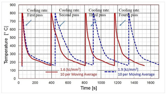 | Cooling time from the first pass to the 160 °C temperature of the last pass [s] | 1484 | 1696 |