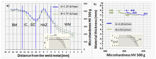 | Heat Input | Maximum Hardness/Distance from the Weld Centerline | |||