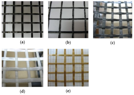 The fabrics used in the tests are bidirectional grids with the following grid sizes: 25.4 mm—basalt fabric, 30 mm—carbon-1 fabric, 10 mm—carbon-2 fabric, 12 mm—AR glass fabric and 15 mm—PBO fabric (Figure 1). The equivalent thickness of the fabric in one direction is 0.033 mm, 0.060 mm, 0.052 mm and 0.014 mm for basalt, carbon-1, carbon-2, AR glass and PBO fabric, respectively. The basalt fabric and carbon-1 fabric are made with coated yarns whereas the other fabrics are made with uncoated yarns. The mechanical properties of fabrics and matrixes are given in Table 2 and Table 3, respectively. Compressive and flexural strengths of the matrixes given in Table 3 were determined according to EN-1015 11.