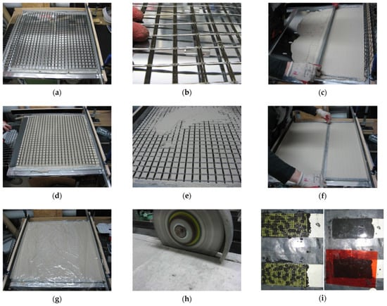 Preparation of the specimens: (a) rectangular mould; (b) PVC spacer; (c) application of the first layer of mortar; (d) fabric application; (e,f) application of the second layer of mortar; (g) fresh mortar covered with PVC film; (h) cutting out specimens; (i) application of the glass grid reinforced polyurethane PS layer on the ends of the specimens.
