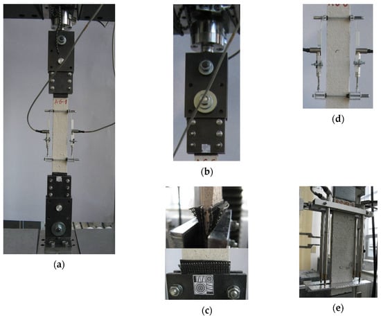 Test set-up: (a) general view; (b) upper clamp with clevis and force transducer; (c) additional layers between the steel plates of the clamping system—2× abrasive mesh, rubber sheet; (d) elongation measurement with 2 LVDTs, (e) elongation measurement with 4 LVDTs.