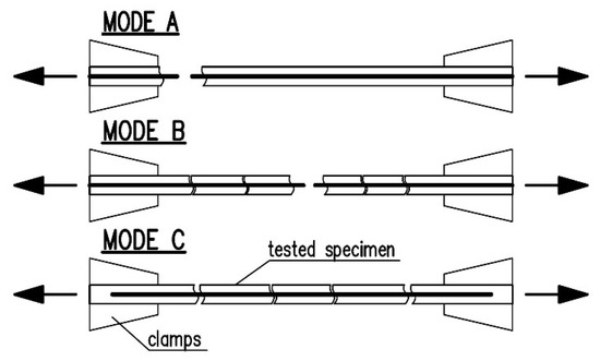 In this research, 35 direct tensile tests of specimens of six composite strengthening systems were performed. Detailed results are presented in Table 5, Table 6, Table 7, Table 8, Table 9 and Table 10 for first crack stress (σt1), first crack strain (εt1), ultimate stress (σu), strain at failure (εu) and coefficient of variation (CV). The tables also give the exploitation ratio ηRf = σu/ft (where ft is the fabric tensile strength according to Table 2) and the failure modes observed in the tests. The possible failure modes of FRCM materials under direct tension were classified based on specifications in the literature [29,30,31,33] as follows (Figure 4): Mode A—failure at the clamps, Mode B—cracking of the matrix of the specimen with tensile rupture of reinforcement, Mode C—fibre slippage within the matrix.
