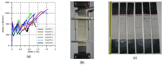 In the case of the B-CTF system, six specimens were tested. As the load was increased, cracks appeared in the mineral matrix. After the first crack formation, a reduction of stiffness was observed. The first crack stress varied from 527 to 880 N/mm2 (average 761 N/mm2) (Figure 5a, Table 5). Before failure, four to six cracks appeared but only two to four formed inside the elongation base (Figure 5b). Crack spacing varied from 50 mm to 150 mm (mean spacing 79 mm). All specimens failed due to tensile failure of the basalt reinforcement—mode B. The ultimate stresses varied from 899 N/mm2 to 1340 N/mm2. The average reinforcement exploitation ratio was 0.63. The tensile strength of the fabric given in Table 2 was not reached in any test. For specimens T-B-CTF-1 and T-B-CTF-3, the failure occurred outside of the measurement base of the LVDTs.