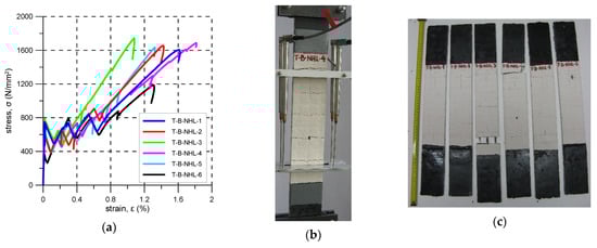 The B-NHL strengthening system consists of a basalt grid embedded in a lime-based matrix. For this system, six specimens were prepared and tested. The first crack formation caused the reduction of stiffness. The first crack stress varied from 370 to 786 N/mm2 (average 653 N/mm2) (Figure 6a, Table 6). Before failure, four to six cracks appeared but only two to four formed inside the elongation base (Figure 6b). Crack spacing varied from 50 mm to 135 mm (mean spacing 80 mm). Most specimens failed due to fibre slippage–mode C, whereas T-B-NHL-4 failed in a mixed manner (two yarns ruptured and one yarn slipped in the matrix)—mode C/B and in the case of specimen, T-B-NHL-3 rupture of the reinforcement occurred—mode B. The ultimate stress levels in the reinforcement were between 1189 N/mm2 and 1744 N/mm2. The average reinforcement exploitation ratio was 0.84. Failure of all the specimens occurred outside of the elongation base.