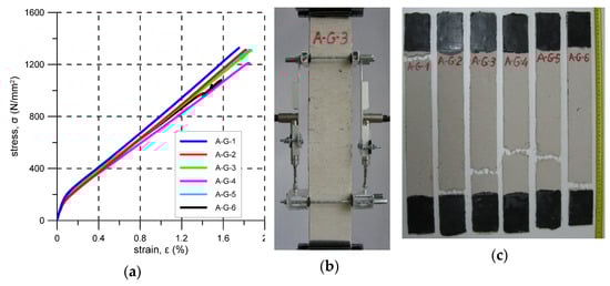 The A-G system is similar to the A-C system but instead of a carbon fibre grid, an AG glass fibre grid is used as reinforcement. For this system, six specimens were prepared and tested. The first cracks were noticed (were visible) at stress levels not less than 280 N/mm2, but based on the σ-ε plots presented in Figure 9a, a loss of linearity of around 110 N/mm2 occurred for lower stresses. During the test, map/pattern cracks were observed (Figure 9b). Crack spacing was about 5–20 mm. All specimens failed due to the tensile failure of glass reinforcement–mode B. The ultimate stress varied from 1081 N/mm2 to 1329 N/mm2 (Table 9). The average reinforcement exploitation ratio equals 0.90. For the specimen fibres A-G-1, A-G-2, A-G-3 and A-G-6, tensile failure occurred near the steel clamps outside the elongation base (Figure 9c). During the test of specimens A-G-6, slippage of the specimen in the lower clamp occurred. The test was stopped and, after the bolts were refastened, the test was continued.