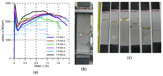 P-MX test results: (a) stress–strain curves; (b) crack pattern; (c) specimens after the test.