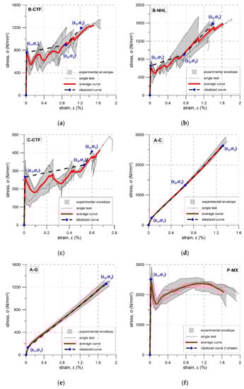 Idealised stress-strain curves: (a) B-CTF; (b) B-NHL; (c) C-CTF; (d) A-C; (e) A-G; (f) P-MX.