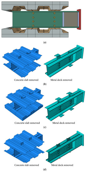 - The ABAQUS contact function was used to model the interaction between components, including the interface between the two channels, between the concrete slab and the metal deck, between the metal deck and the beam, between the shear connectors and concrete slab, between the bolt shanks and the web of the beam, between the bolt heads and the web of the beam, and between the web of the channel and the shear connectors.