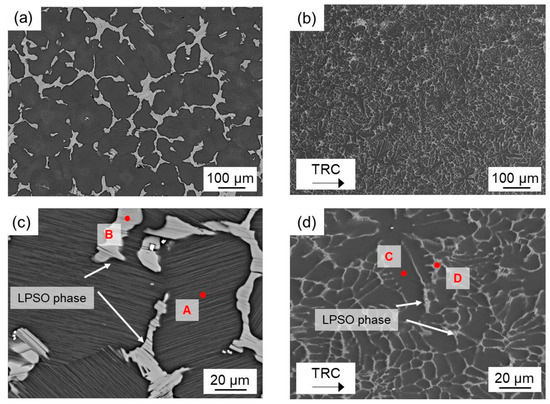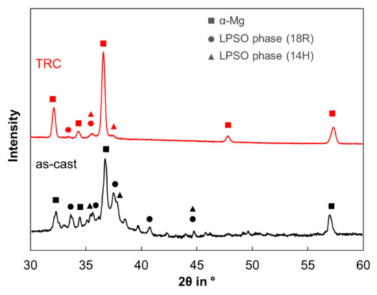 - The microstructure of both conditions mainly consists of the α-magnesium matrix and network-like LPSO phases located along the grain boundaries. LPSO phases could be assigned to 18R or 14H structures. Twin-roll casting leads to a finer microstructure compared to conventional casting. After conventional casting, thin lamellar LPSO phases arise within the α-magnesium grains, which can be assigned to the 14H structure. In the TRC condition, lamellar LPSO phases are not observed.