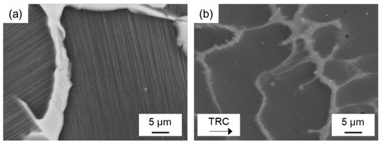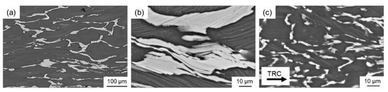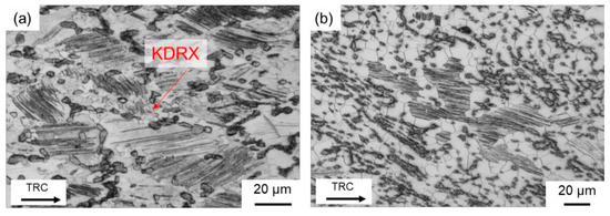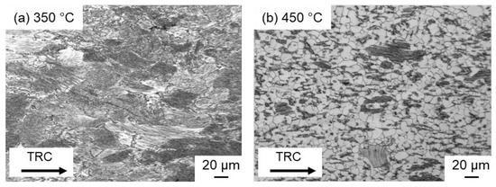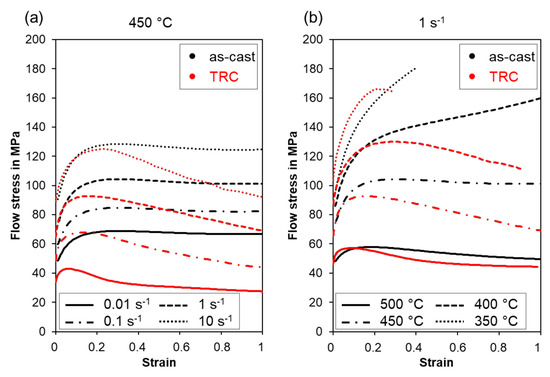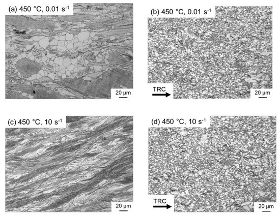- During hot deformation of the conventionally cast material, it is assumed that at 450 °C dynamic recovery is the dominant softening mechanism. Only a small amount of dynamic recrystallization can be observed, indicating that the DRX remains incomplete even at high strains and low strain rates. The TRC samples showed softening via dynamic recrystallization, where an almost completely recrystallized structure developed at both high (10 s−1) and low (0.01 s−1) strain rates.