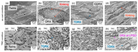 - At higher temperatures (500 °C), DRX occurs in both conditions. The as-cast state exhibits a high amount of network-like and lamellar LPSO phases, which are assumed to be responsible for a delayed DRX. The main recrystallization mechanisms of the as-cast condition are CDRX, PSN and TDRX. Kink-aided dynamic recrystallization can hardly be detected. In the TRC initial state, the block-like LPSO phase is more finely distributed and, above all, less strongly connected. Lamellar LPSO phases are precipitated within the Mg matrix during cooling and different DRX mechanism take place depending on deformation temperature. The fine distribution of the LPSO phase and less network-like nature favor DRX by PSN. Besides this, TDRX and KDRX can be observed.